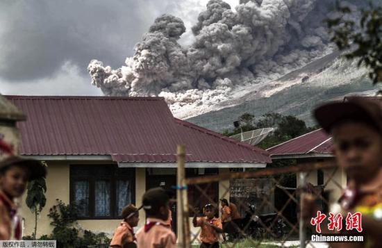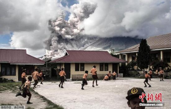 当地时间2017年2月10日,印度尼西亚卡洛,印尼锡纳朋火山爆发。村镇内的小学生在教室外玩耍。
